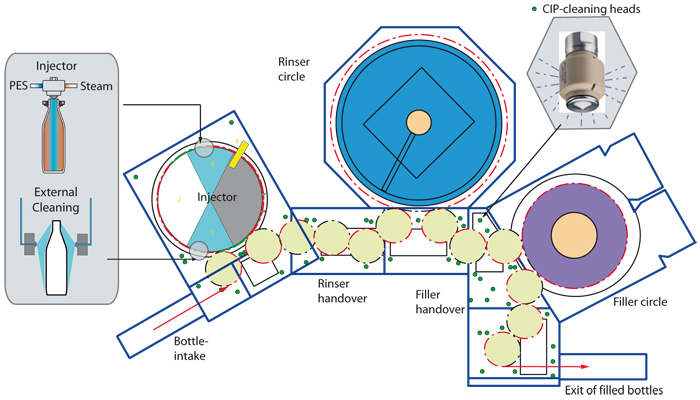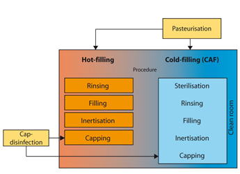 Cold aseptic bottling plants require new plant concepts for the disinfection and/or sterilization of bottles and caps, in the areas of cleaning- and disinfection technology, equipment- and machine hygiene as well as the handling of personnel. Bottle rinsers as well as cappers are positioned in clean rooms.
