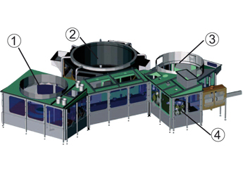 The aseptic plant consists of the following modules: sterilizer (1), rinser (2), filler (3), inertization and capper (4). For the most part, these modules are linked via Neck-Handling-Stars (clamps) in a block assembly. The modules are located in the clean room. A disinfection / sterilization of all outer surfaces within the clean room has to be conducted in regular intervals. Lechler nozzles in hygienic design are applied successfully for disinfection / sterilization by the bevereage industry.