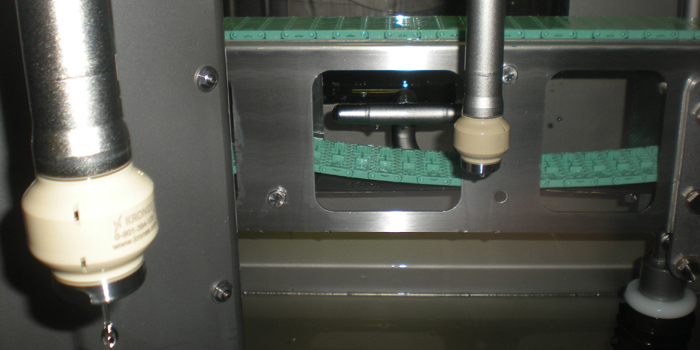 As soon as the bottle was brought in position, theprecision nozzle sprays peracetic acid in a superheated steam mixture. The regulation of the liquid quantity is made by an upstream dosing pump. In order to guarantee a simultaneous supply of steam and acid, opening and reasoning are made by single solenoid valves.